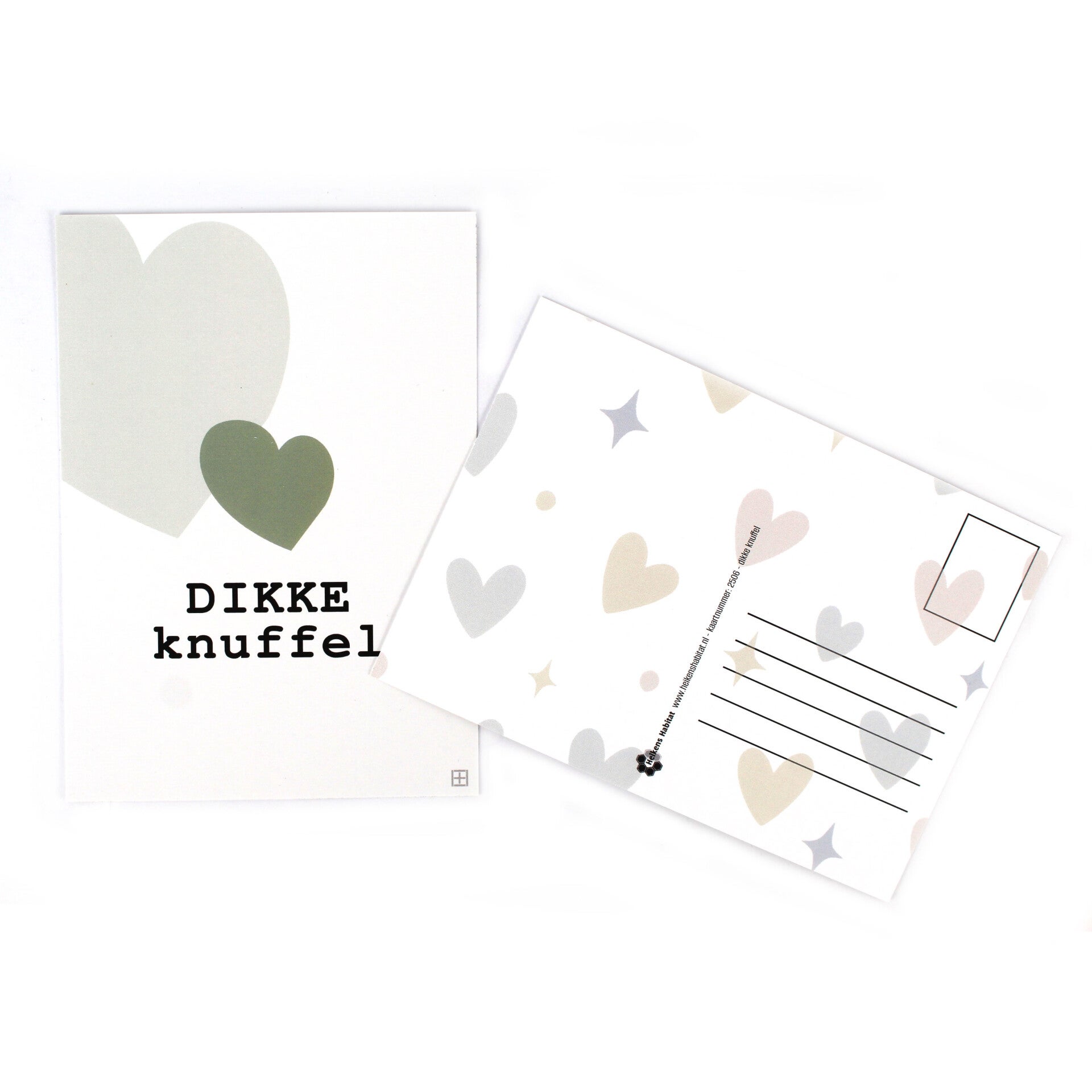 Stuur een papieren knuffel met deze ansichtkaart met een illustratie van twee hartjes in zachte groene tinten met de tekst: "DIKKE knuffel". Perfect om iemand die wel een omhelzing kan gebruiken blij te maken.